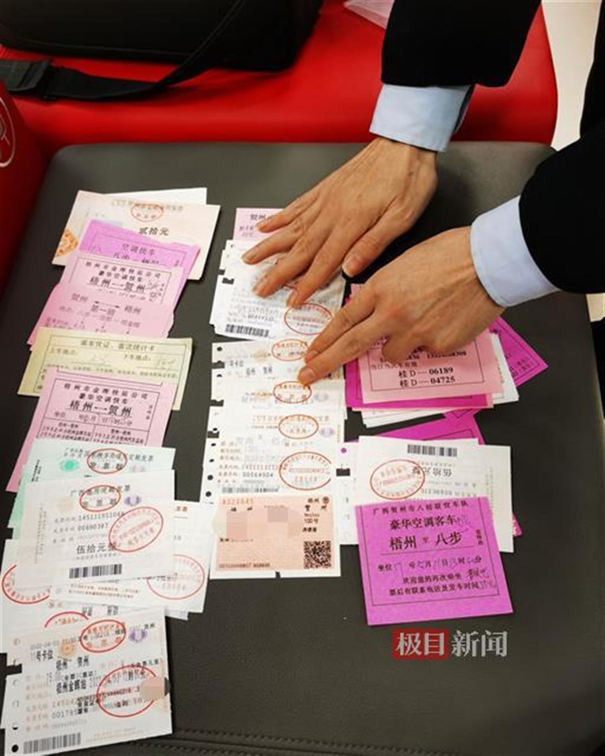 李某元展示2009年以来从梧州到贺州往返的车票