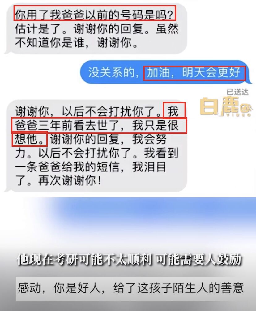 据@白鹿视频3月27日消息,3月26日,陕西西安。 孩子给父亲生前使用的手机号码发短信,讲述自己的现状,并称非常想念爸爸。新机主收到短信以其父亲的名义暖心回复,鼓励他收拾好心情,重新出发。收到这条来自“爸爸”的回复,孩子称自己泪目了,并不断表达感谢。