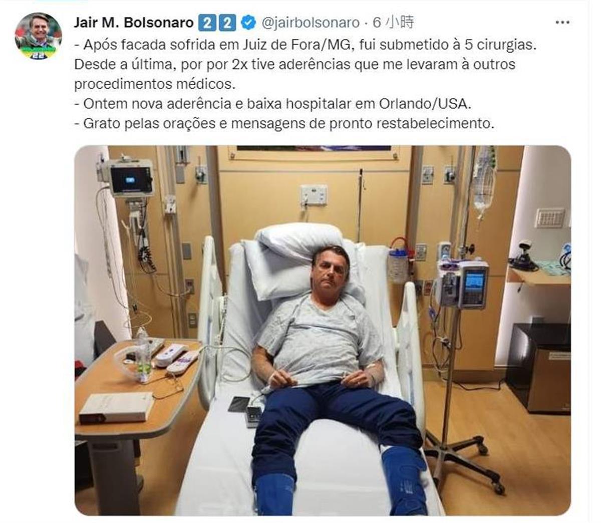 博索纳罗上传在美国佛州的医院病床照片(图片来源:美联社)