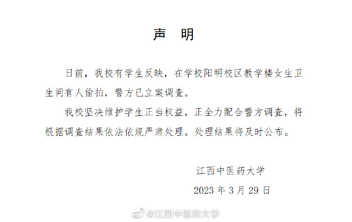 3月29日,有网友发文称,江西某高校一男生躲在女厕内被抓,此事引发广泛关注。29日晚,@江西中医药大学官微发布声明称:警方已立案调查,处理结果将及时公布。