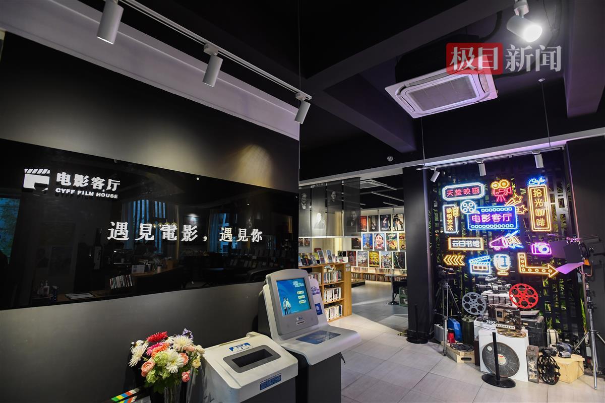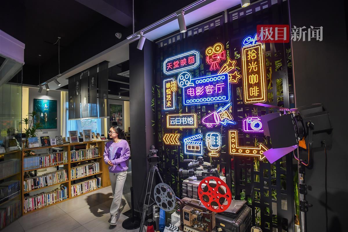 留声机、投影、音响、灯光、整面墙的老电影海报、咖啡吧台、图书、书架……共同构成了云曰书馆的气质。云曰书馆门口还设置有自动借还书机,读者看中的图书,可以在这里自行借阅。云曰书馆的前身是天堂映画影业“CYFF电影客厅”,以电影放映和电影交流为主要特色。
