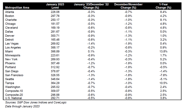 同时,标普凯斯-席勒指数近期追踪的美国房价在1月份继续降温(注:这个数据有滞后性,现在就刚出到1月),经季节性调整后比去年12月份下降了0.2%,比去年同期上涨了3.8%——这是自2019年12月以来的最小涨幅。