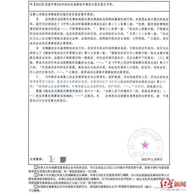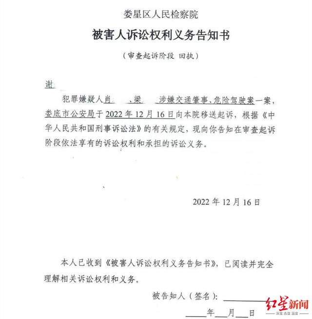 据悉,该案中还有一人涉案。家属去年12月收到的“娄星区人民检察院被害人诉讼权利义务告知书”显示,犯罪嫌疑人肖某某、梁某某涉嫌交通肇事、危险驾驶一案,娄底市公安局于2022年12月16日向本院移交起诉。