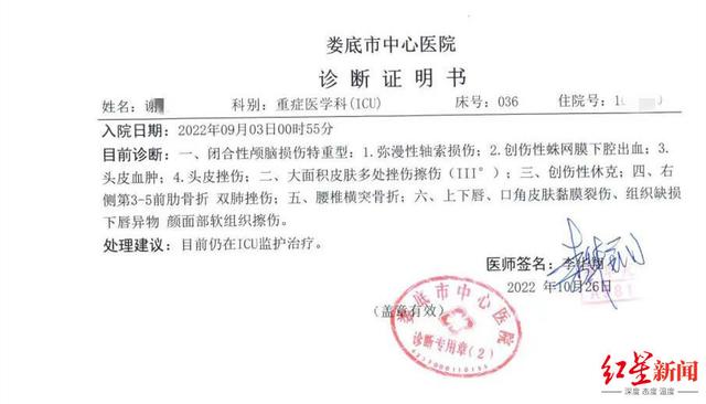 4月10日下午,红星新闻记者联系到谢某丈夫周先生时,他正准备陪妻子进医院高压舱进行康复治疗。周先生称,当时妻子被拖行后,与地面相撞造成特重型闭合性颅脑损伤和特别严重的全身三分之一擦伤。