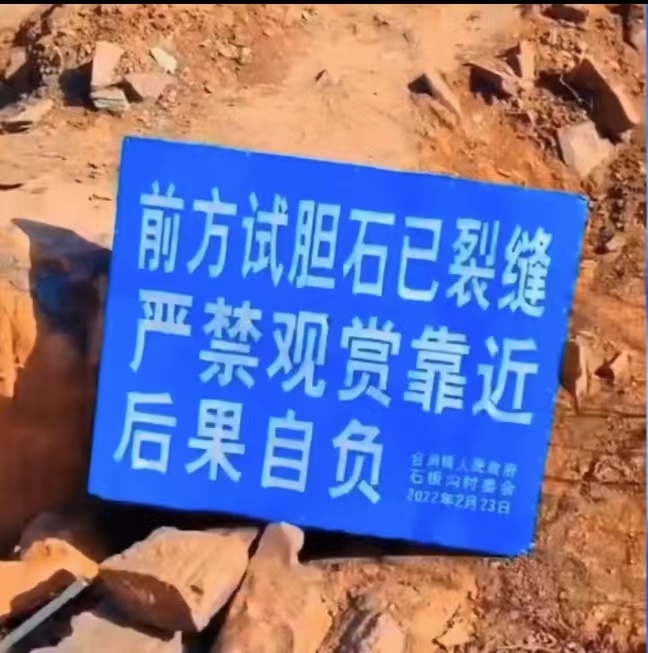 网传视频显示,试胆石从悬崖上伸出成一个小平台,跟悬崖连接的地方已经出现裂缝,但仍有游客站上试胆石小平台拍照拍视频。而悬崖上一块合涧镇政府和石板沟村村委设置的提示牌写着“前方试胆石已裂缝,严禁观赏靠近,后果自负”,落款是2022年2月23日。
