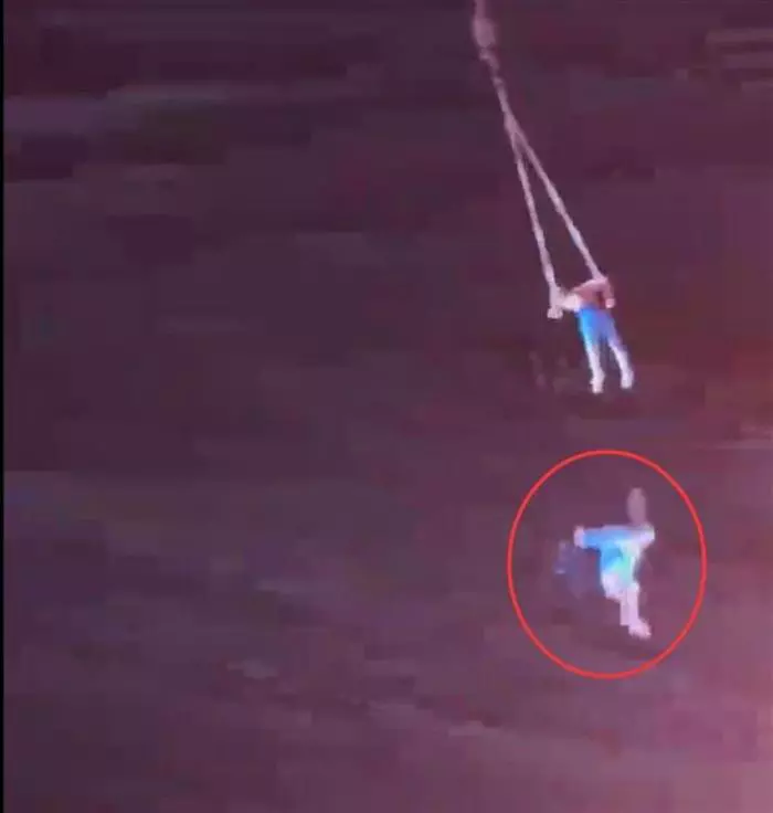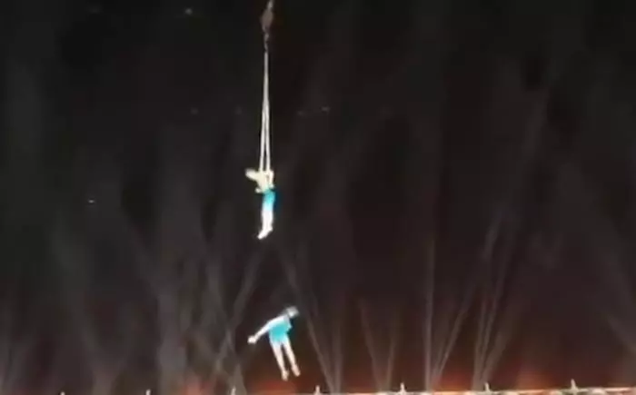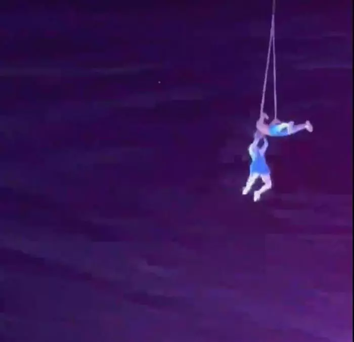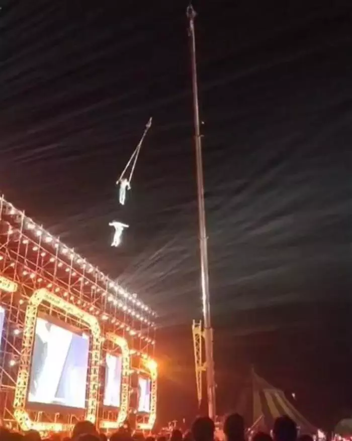 多段网络视频显示,一个户外演出的现场上,表演高空杂技的男女两名演员抓住吊环,被起重机吊到空中,升空的过程中,女演员突然从空中坠落至舞台上,现场观众发出阵阵惊呼声。