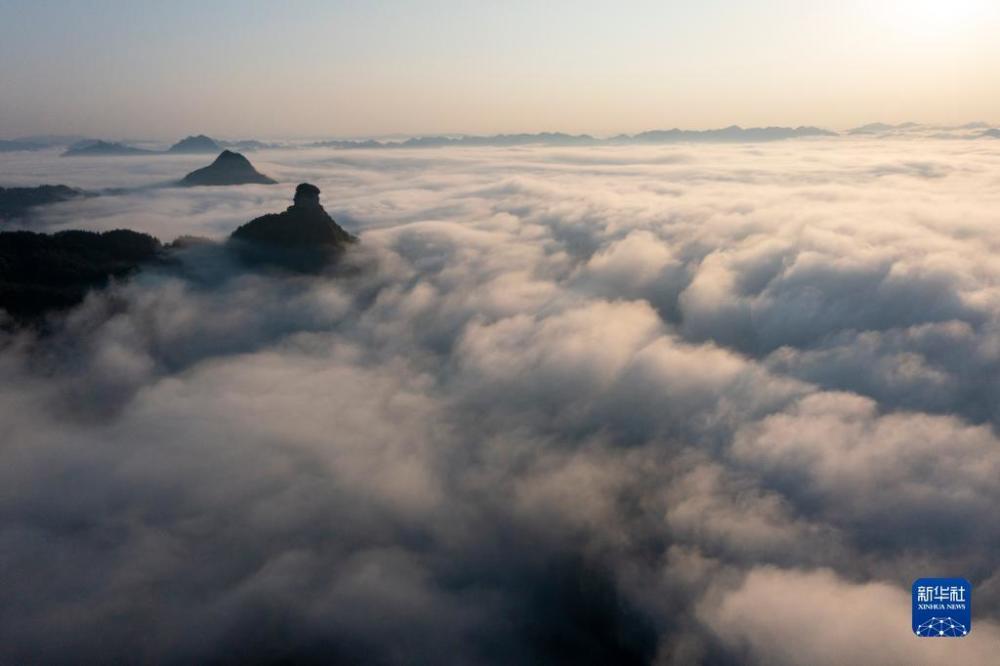 这是4月19日拍摄的金佛山日出时分的云海景观(无人机照片)。新华社记者 刘潺 摄