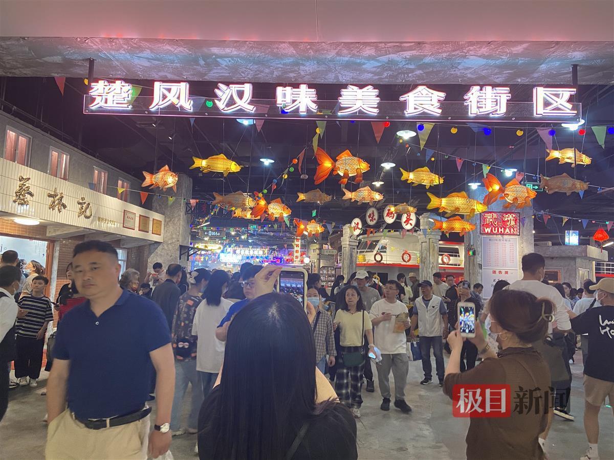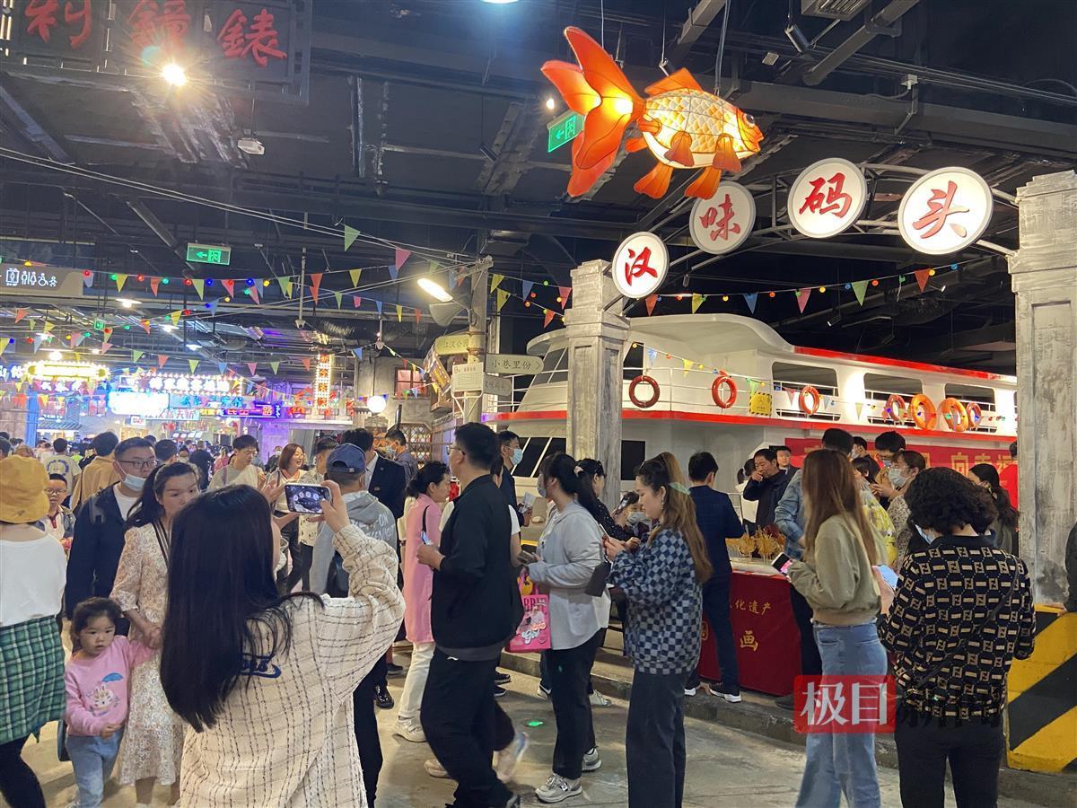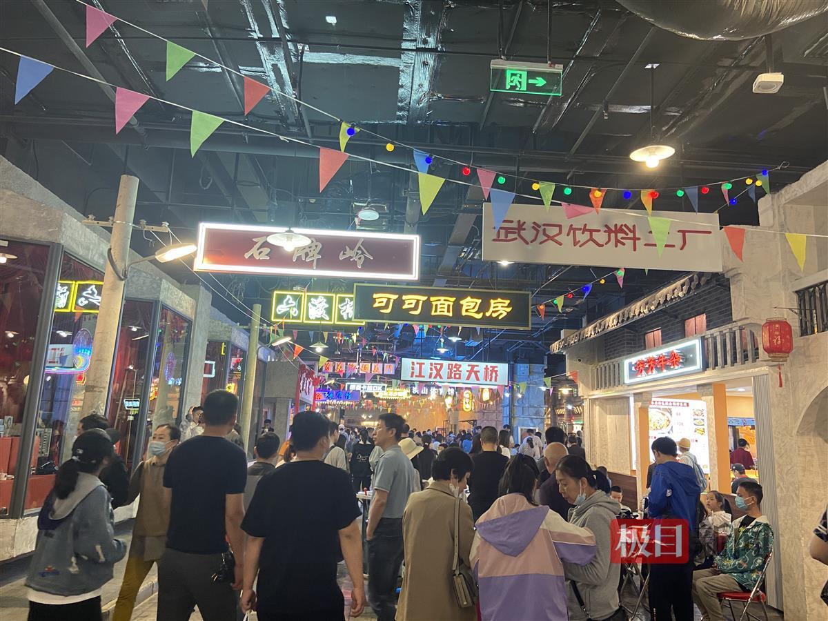5月1日,“五一”假期的第三天,极目新闻记者来到武商梦时代广场,二号线宝通寺B出口出站后,跟着人群走进了梦时代内部。刚踏入负一楼楚风汉味美食街区,记者感觉一下子穿越到了上世纪八九十年代的武汉,不少游客在此处拍照打卡。
