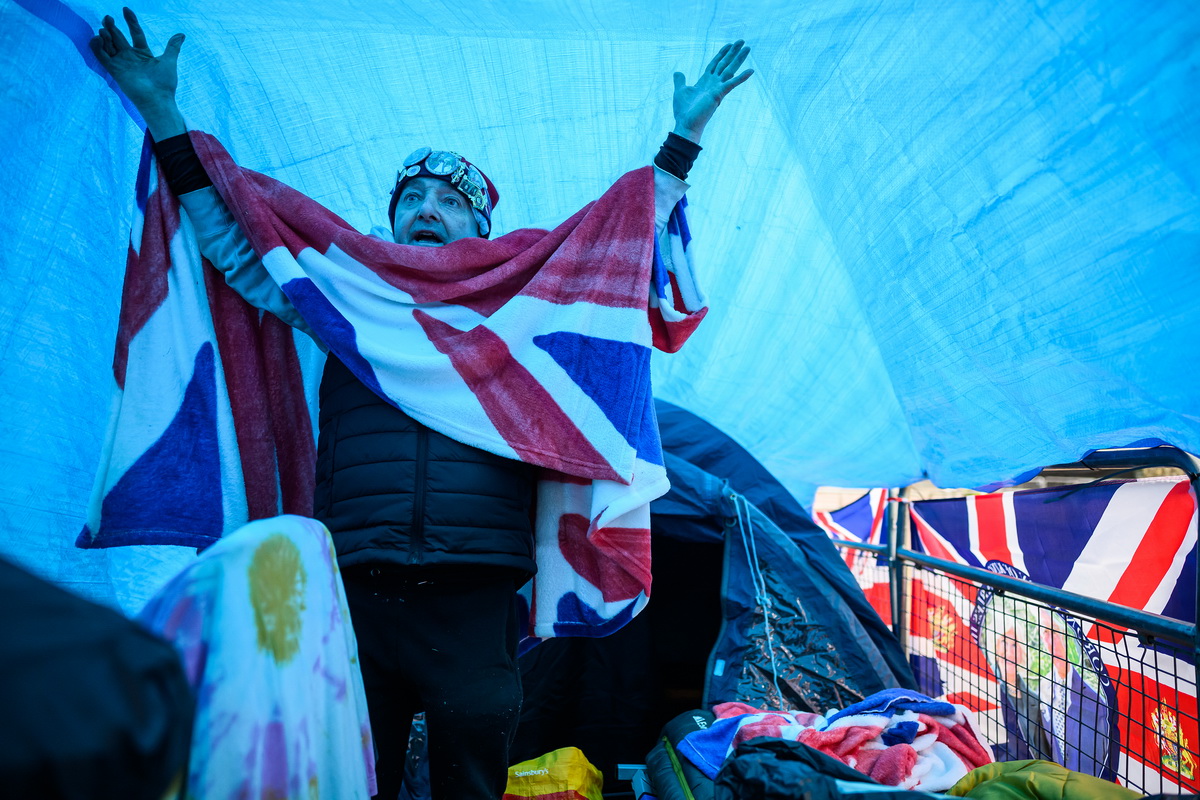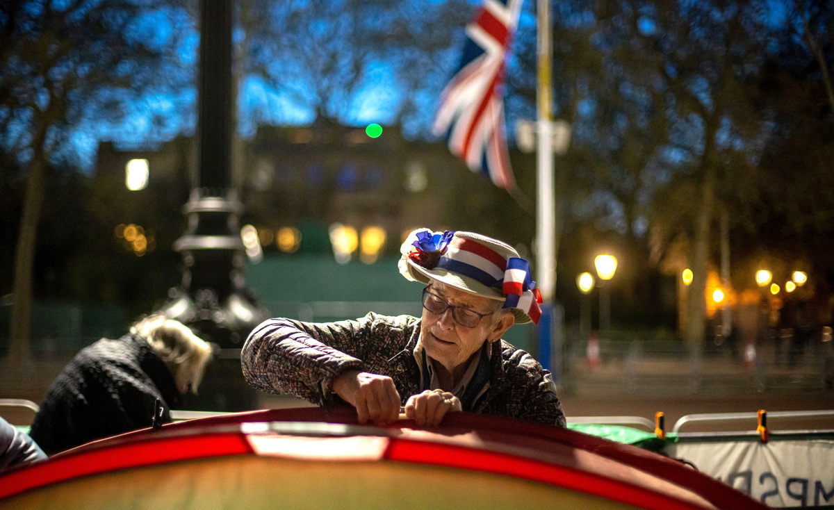 当地时间2023年5月3日,英国伦敦,一名王室粉丝通宵守在自己的位置。