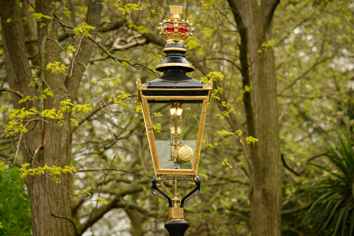当地时间2023年5月2日,英国伦敦,白金汉宫附近的英国国王加冕典礼路线上,一盏英国天然气公司的金色煤气灯上装饰着皇冠。