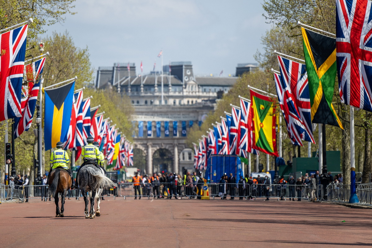 当地时间2023年5月3日,英国伦敦,英国国旗和英联邦国家的旗帜装饰着通往白金汉宫的林荫道,警察在十字路口巡逻。