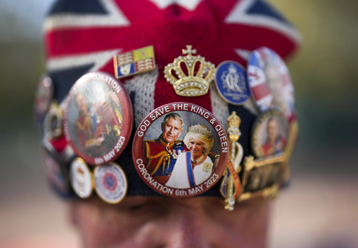 当地时间2023年5月3日,英国伦敦,一名男子头戴徽章表示对王室的支持。