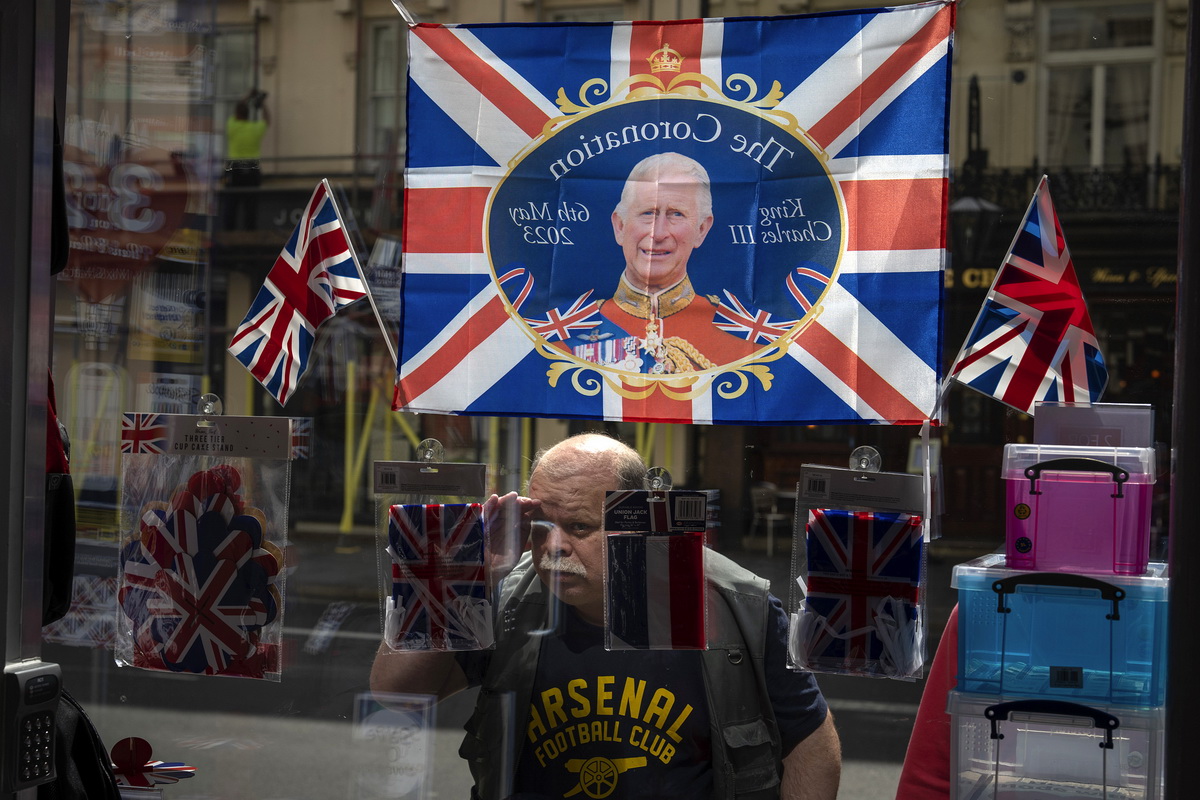 当地时间2023年5月3日,英国伦敦,一名男子往装饰着纪念英国国王查尔斯三世加冕旗帜的纪念品商店里张望。