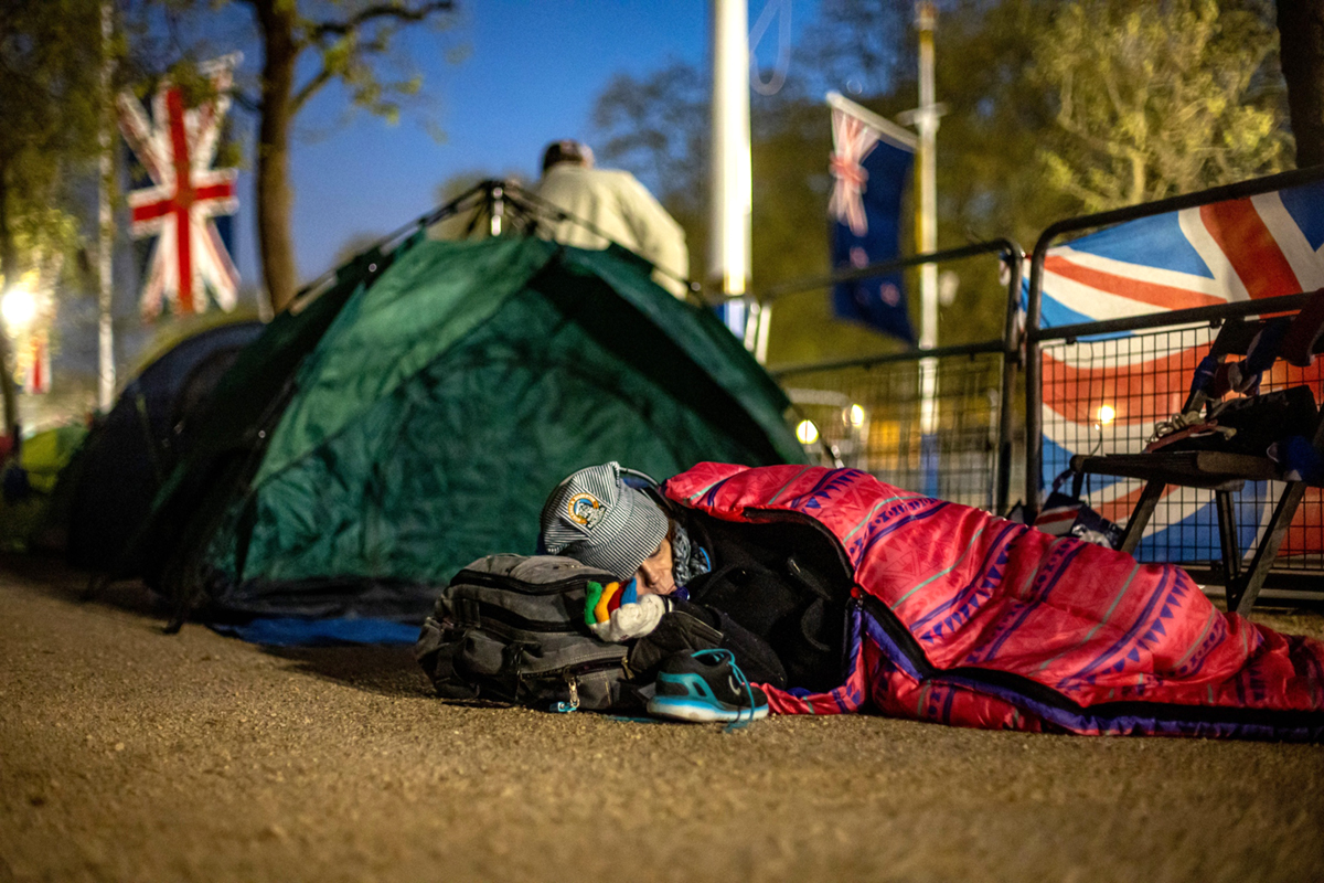 当地时间2023年5月3日,英国伦敦,王室粉丝提前在加冕游行路线上搭帐篷等待。