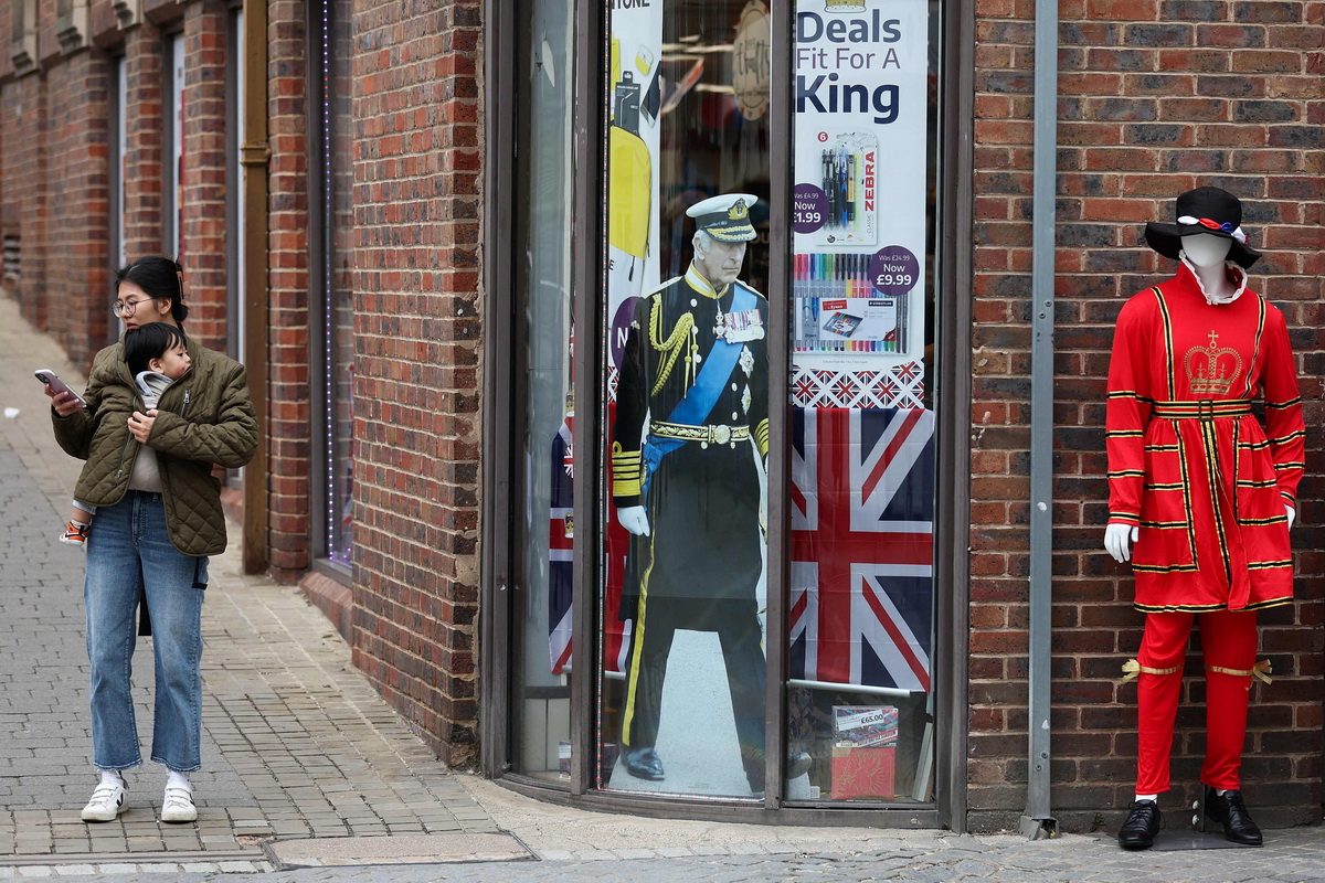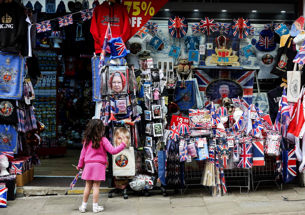 当地时间2023年5月2日,英国温莎,一个孩子往一家出售王室纪念品的商店里看。