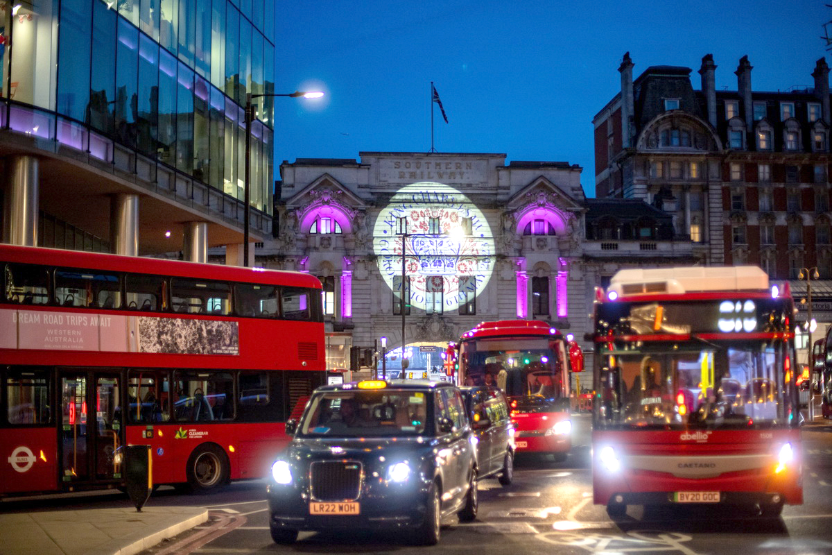 当地时间2023年5月3日,英国伦敦,维多利亚火车站大楼上投影着查尔斯三世加冕典礼的官方标志。