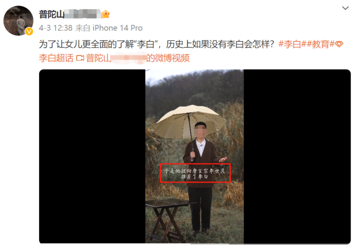 记者搜索发现,除了文章所指的视频号外,“普陀山小帅导游”博主在抖音及微博均有相关账号。文章发出后,5月5日上午,其视频号及抖音号主页已经看不到这则《诗仙李白》的视频,其微博账号则还保留着视频,并配文“为了让女儿更全面的了解‘李白’,历史上如果没有李白会怎样?”在这则长约7分钟的视频中,记者发现,除了此前六神磊磊指出了其视频里将“蚍蜉撼树”读成“蜉蝣撼树”外,博主还将“唐玄宗李隆基”写成了“唐玄宗李世民”。