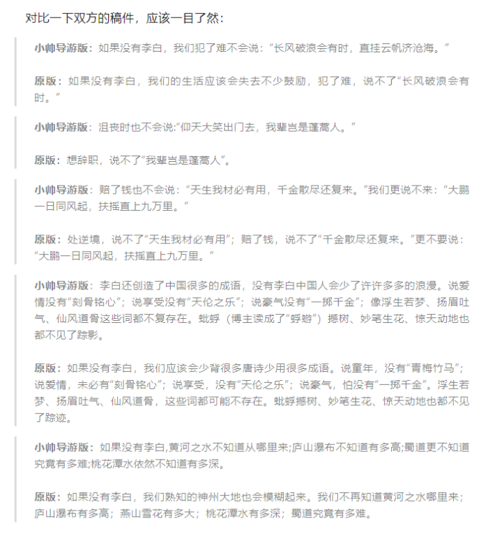 但如果换个视角,这一浪漫行为似乎不太浪漫。5月3日晚,知名自媒体人“六神磊磊”在其微信公众号发文称,一位名为“普陀山小帅导游”的博主发布的视频号节目《诗仙李白》,其文案与自己2017年发布的文章《如果没有李白》存在多处相似,该节目中没有注明出处和原作者,并声称是“献给女儿”的。对此,六神磊磊提出质疑,“您就拿这个拍给女儿吗?”