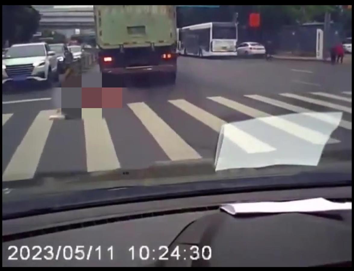 一辆跟在卡车后方的小车上的行车记录仪,拍下了当时的过程。行车记录仪显示,11日上午10时20分许,卡车正在龙舟路由西向东行驶,因为道路边有施工,路上车辆行驶缓慢。在一处斑马线前,卡车在停车等待行人通过斑马线后才起步。随后,卡车后轮跳动了一下,后车上的人随即看见一名老人倒在路上。