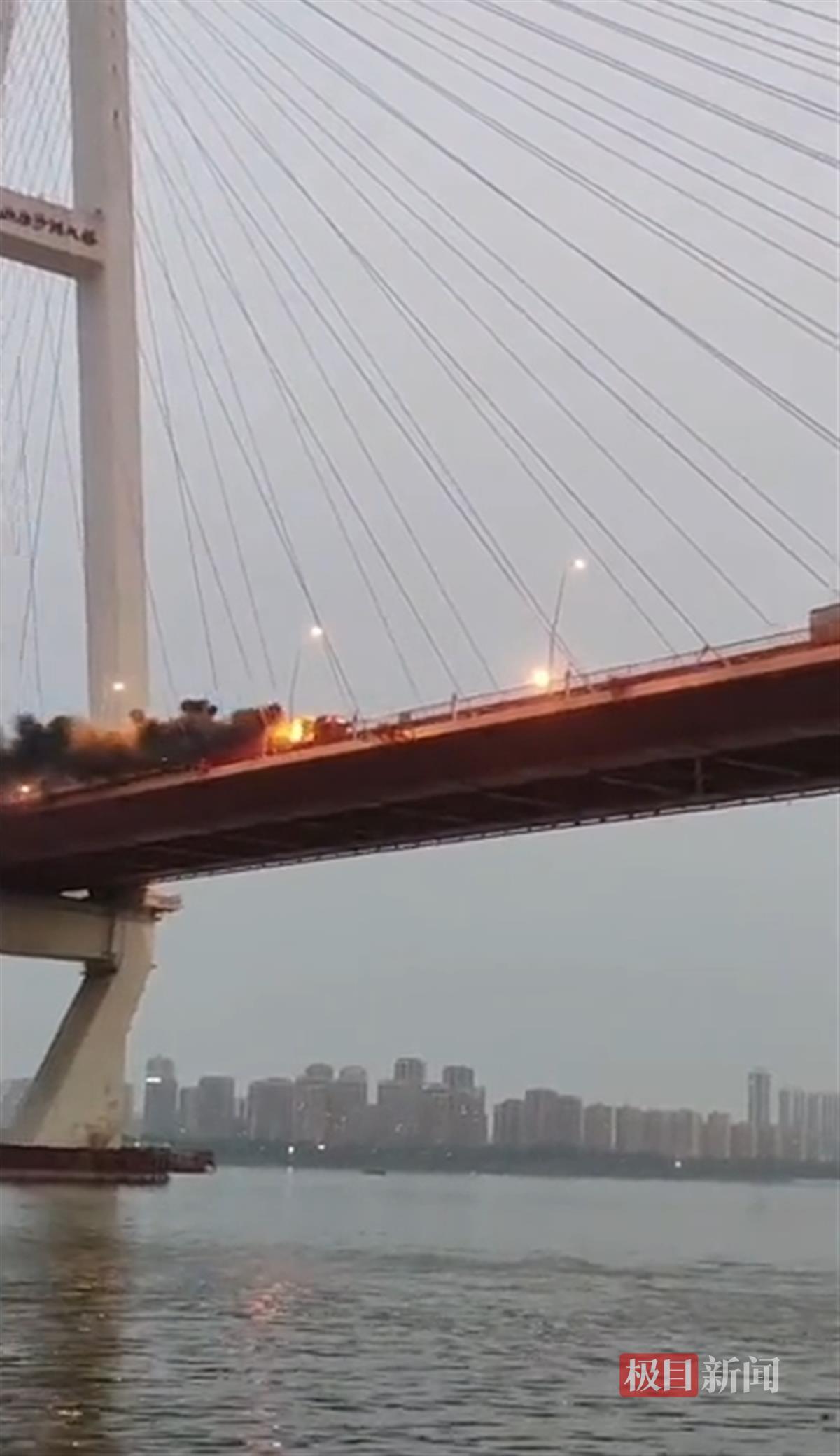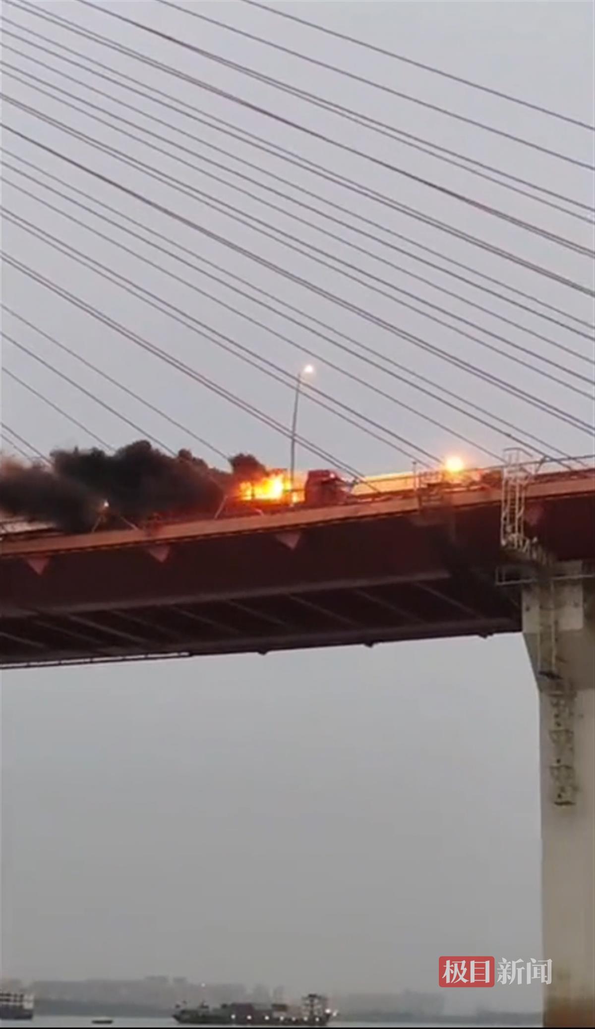 读者拍摄的视频显示,5月13日晚,在武汉市白沙洲长江大桥上,一辆半挂货车上货物着火,燃起熊熊烈火,现场浓烟滚滚,情况危急。此时,半挂货车并没有在桥面中间停下,而是继续快速向前行驶,来到靠近江北下桥位置。