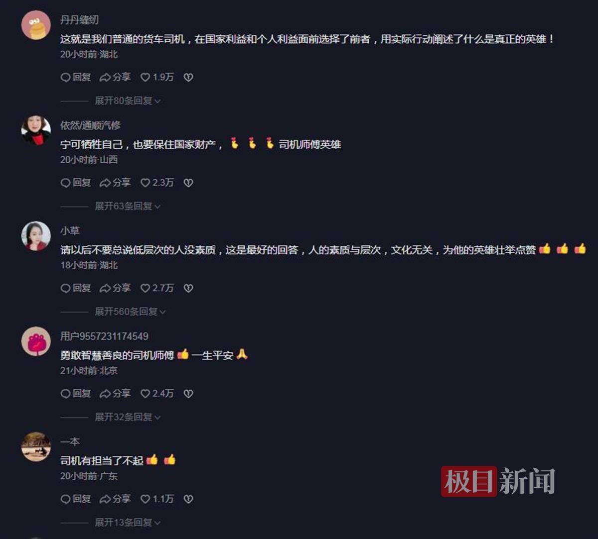 网友“丹丹缝纫”:这就是我们普通的货车司机,在国家利益和个人利益面前选择了前者,用实际行动阐述了什么是真正的英雄。