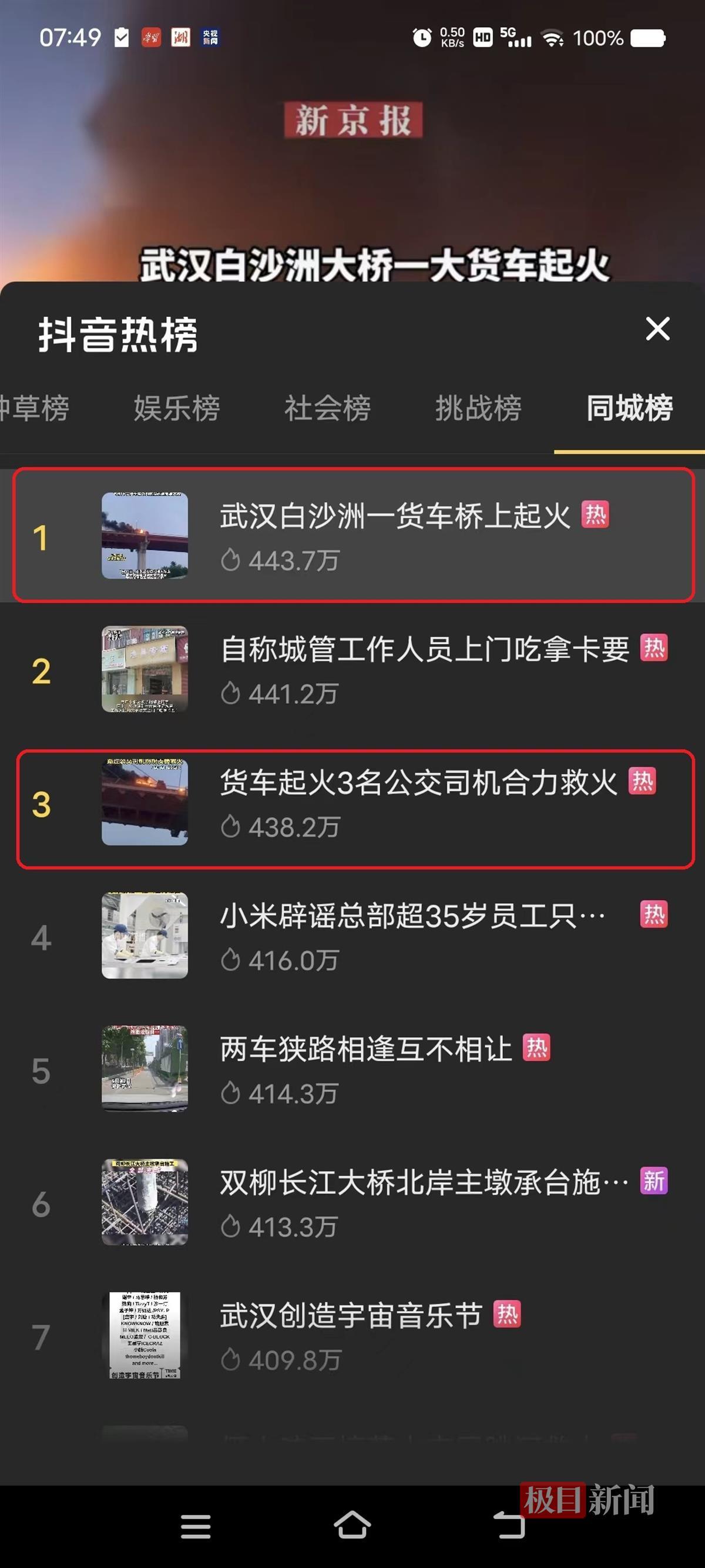 5月13日19时许,武汉市白沙洲长江大桥上,一辆装载废旧电池的半挂货车在桥中起火,货车驾驶员奋力驶往江北下桥处避免造成桥梁损坏,过路公交司机及消防员合力扑救,大火被及时扑灭,万幸无人员伤亡。随后,“货车起火司机不畏爆炸迅速驶离大桥”话题迅速登上热搜。武汉消防负责人肯定道:“货车司机冷静应对,武汉群众热情仗义,消防力量及时处置,此次三方力量联动有效灭火是非常典型的处置案例。”