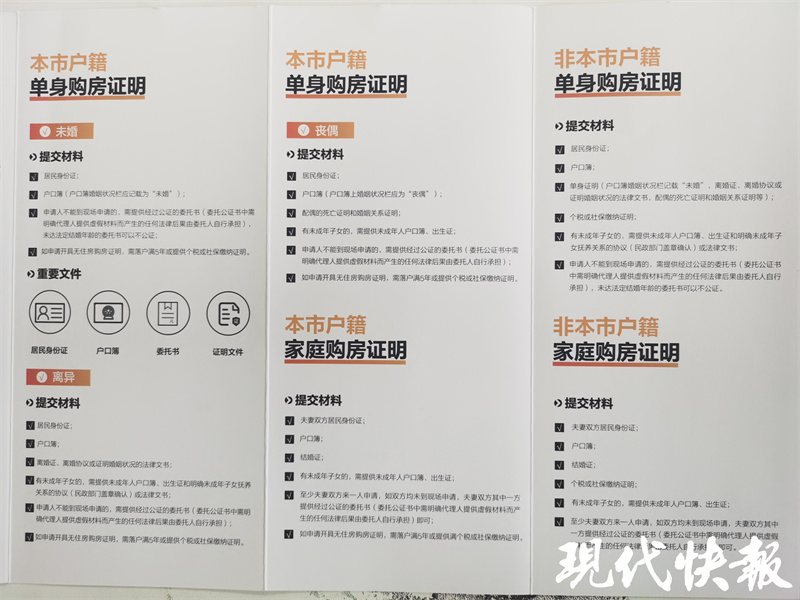 “请问产业集聚区购房证明怎么办?”工作人员表示,只要是南京户口,其他没有什么限定要求。记者举例问,如在秦淮区两年内已有购房记录,是否存在追溯问题?工作人员表示,“不用不用,直接N+1。”凭此证明购买产业集聚区的商品房和二手房有何不同?工作人员称并不清楚,具体要问开发商。至于需要带什么材料,工作人员回应,和普通的购房证明一样,携带身份证、户口本、个税或社保缴纳证明等等材料,来线下窗口正常办理。至于本市户籍或非本市户籍,单身、家庭购房等不同情况,“楼下有宣传单,可以拿回去看下。”记者在咨询台找到一份南京开具购房证明指南,右上角标明为2022年第一版。