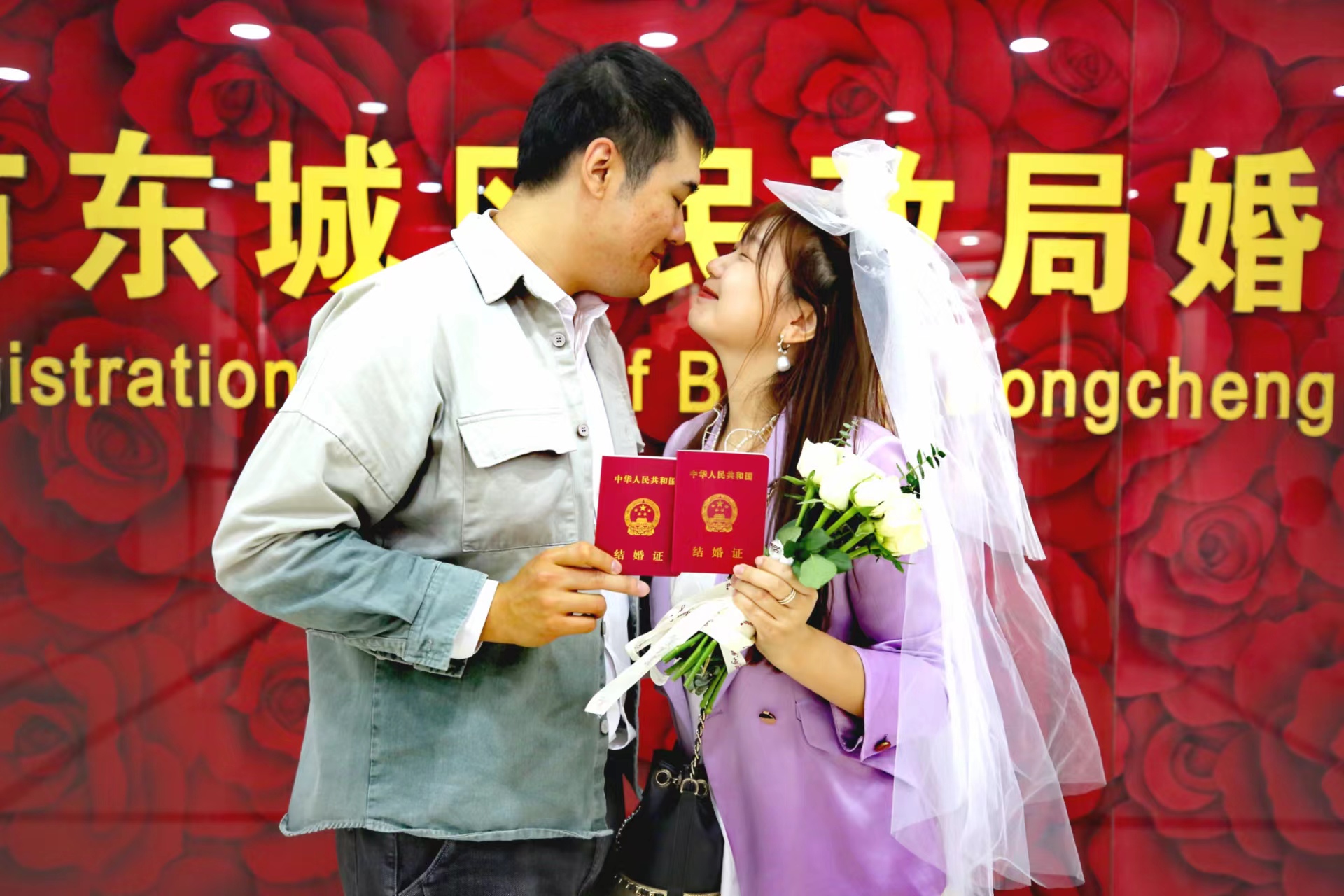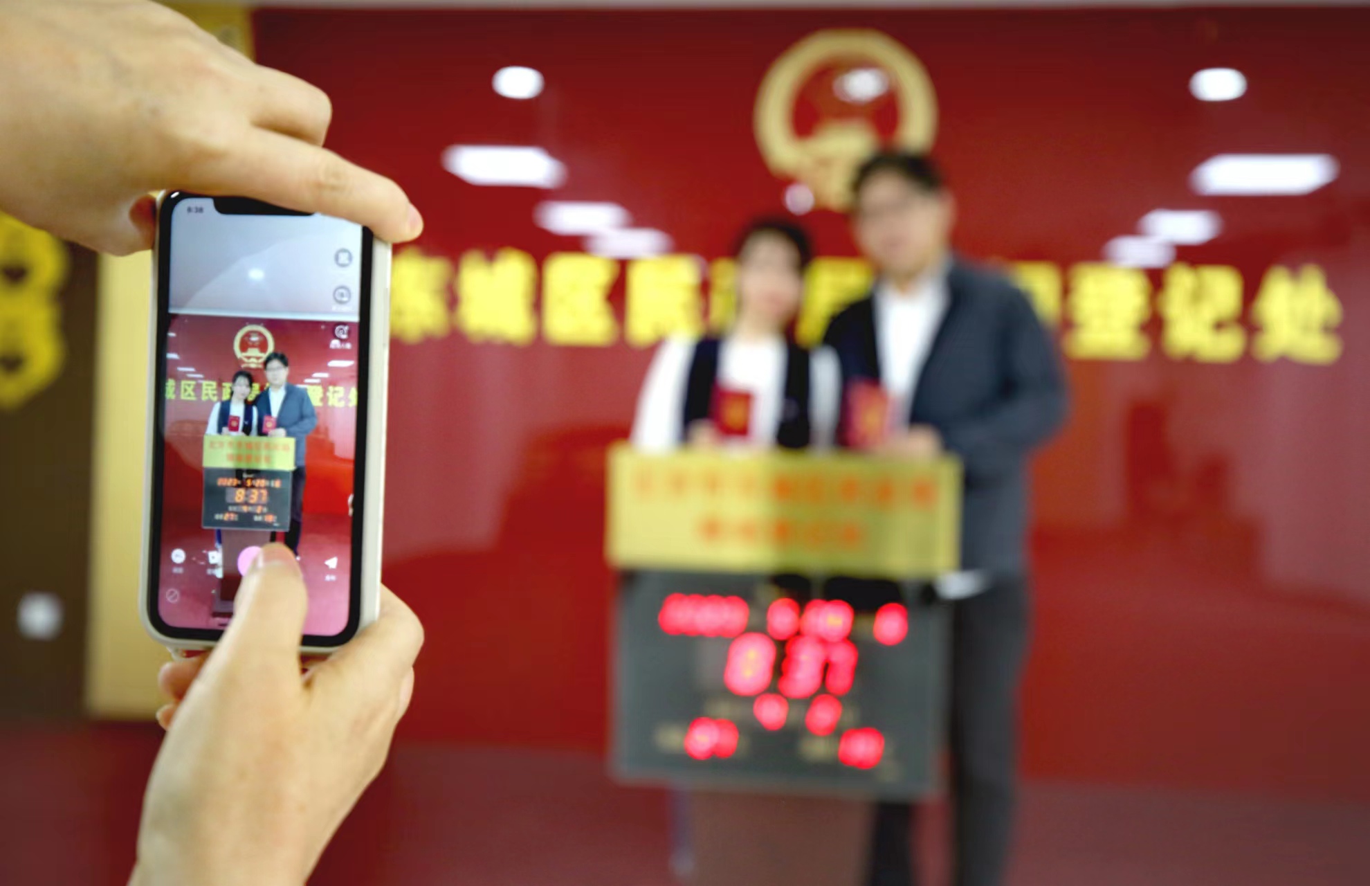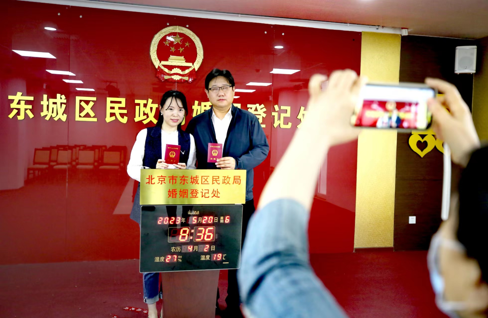 李先生与赵女士是最早一批登记成功的新人。举着结婚证,他们在满是玫瑰图案的婚姻登记牌下拍照记录美好一刻。他俩高中毕业后同样选择勤工俭学,打工时互相认识了对方,今年已经恋爱5年了:“在‘520’当天领证,也是想讨个好彩头,让每年的结婚纪念日都更有意义。”
