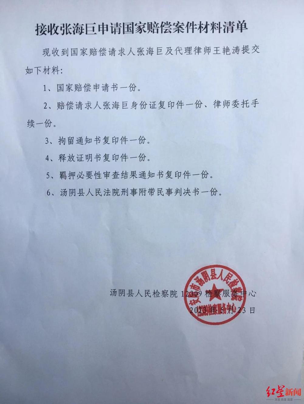 记者获悉,汤阴县检察院已接受相关材料。张海巨表示,自事发后被抓至2022年9月30日取保候审,自己一共被羁押366天。“为期一年的错误羁押,对我的工作生活造成了非常大的伤害,母亲精神状态很差,释放后瘦到女儿认不出,让我非常痛心。”