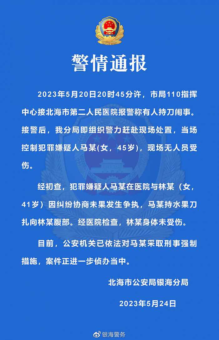 5月24日,广西北海市公安局银海分局通报,5月20日20时45分许,市局110指挥中心接北海市第二人民医院报警称有人持刀闹事,接警后,警方即组织警力赶赴现场处置,当场控制犯罪嫌疑人马某(女,45岁),现场无人员受伤。