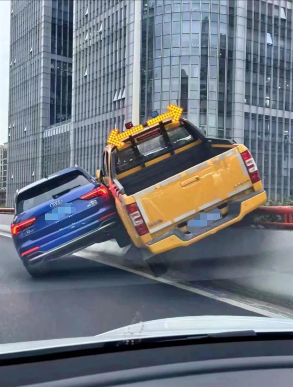 两车互相“斗气”,蓝车将黄车顶上高架护栏(来源网络)