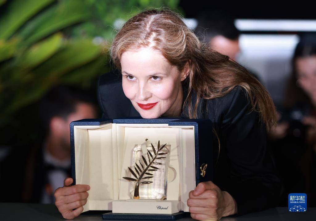 ▲5月27日,在法国戛纳,法国导演茹斯汀·特里叶展示“金棕榈奖”奖杯。图据新华网