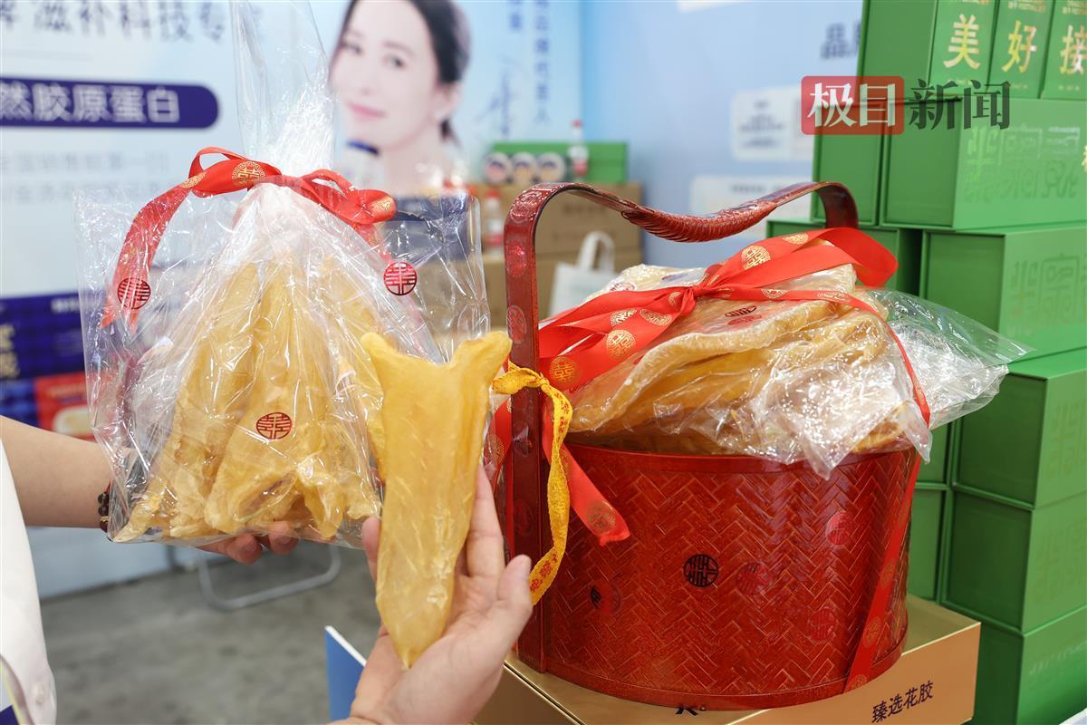参展商官栈花胶负责人告诉极目新闻记者,这次特意带来了岭南地区最受青睐的,存放超10年的深海鱼胶。这批鱼胶来自五年以上、体重30斤以上的深海鱼,鱼胶色泽金黄透亮,大小比10.9英寸的iPad 还大,具有补血、化瘀、修复等功效,具有一定收藏价值。