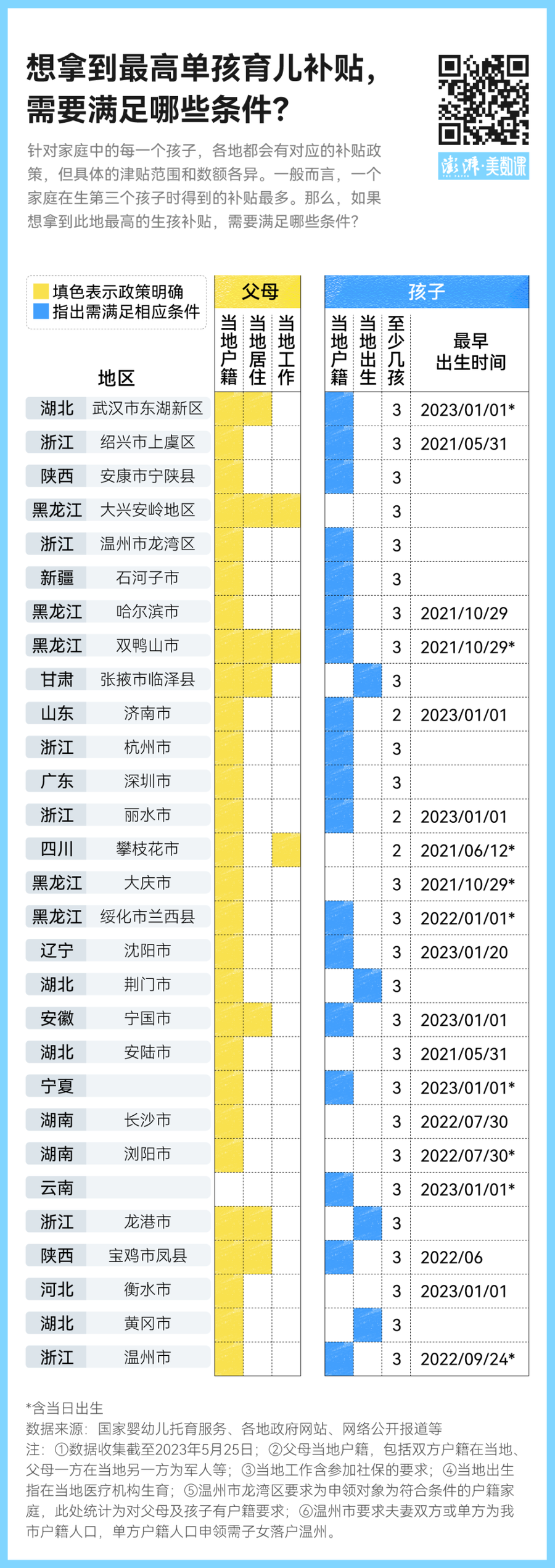 要想拿到最高补贴,新生儿的出生时间也有讲究。绝大多数补贴限定在当地政策出台之后出生的三孩,仅有少数可补发给符合国家三孩政策的家庭。