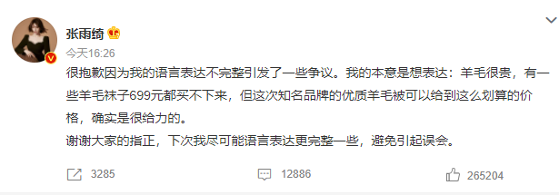 日前,知名女星张雨绮在直播带货时,一款羊毛被售价699元,张雨绮直播中说"699(元)我觉得都买不了个袜子",引发网友热议。6月11日下午,张雨绮发文回应此事,称语言表达不完整,本意是想说羊毛很贵,有一些羊毛袜子699元都买不下来。