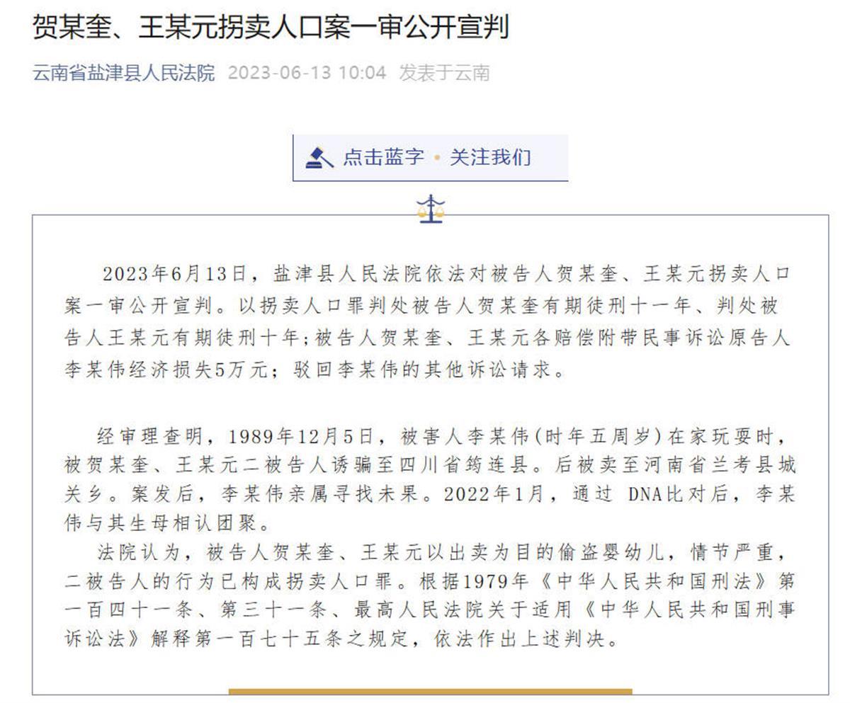 审理查明,1989年12月5日,被害人李景伟(时年五周岁)在家玩耍时,被贺某奎、王某元二被告人诱骗至四川省筠连县。后被卖至河南省兰考县城关乡。案发后,李景伟亲属寻找未果。2022年1月,通过DNA比对后,李景伟与其生母相认团聚。