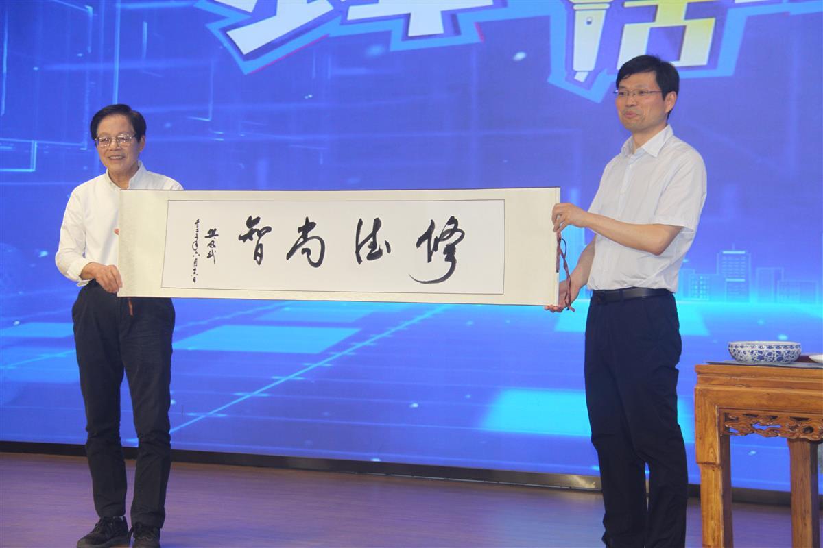 在“致敬院士”环节,受武汉六中校长朱伟霖邀请,有着深厚书法功底的樊院士现场挥毫泼墨,写下了该校有着120年历史的校训“修德 尚智”,引来现场一片欢呼。