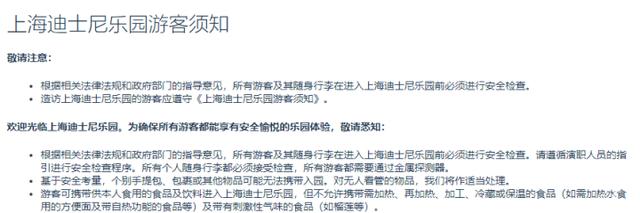2019年9月,上海迪士尼度假区开始正式实施其主题乐园的食品携带新规。游客可携带供本人食用的食品及饮料进入上海迪士尼乐园,但不允许携带需加热、再加热、加工、冷藏或保温的食品及带有刺激性气味的食品。