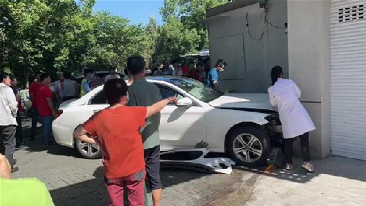 现场视频中,一辆白色奔驰车前盖撞在墙角,车头部分受损,一名男子躺在车头下方的墙角处。另一段视频中,众人合力将车抬起,将被撞的男子救了出来。