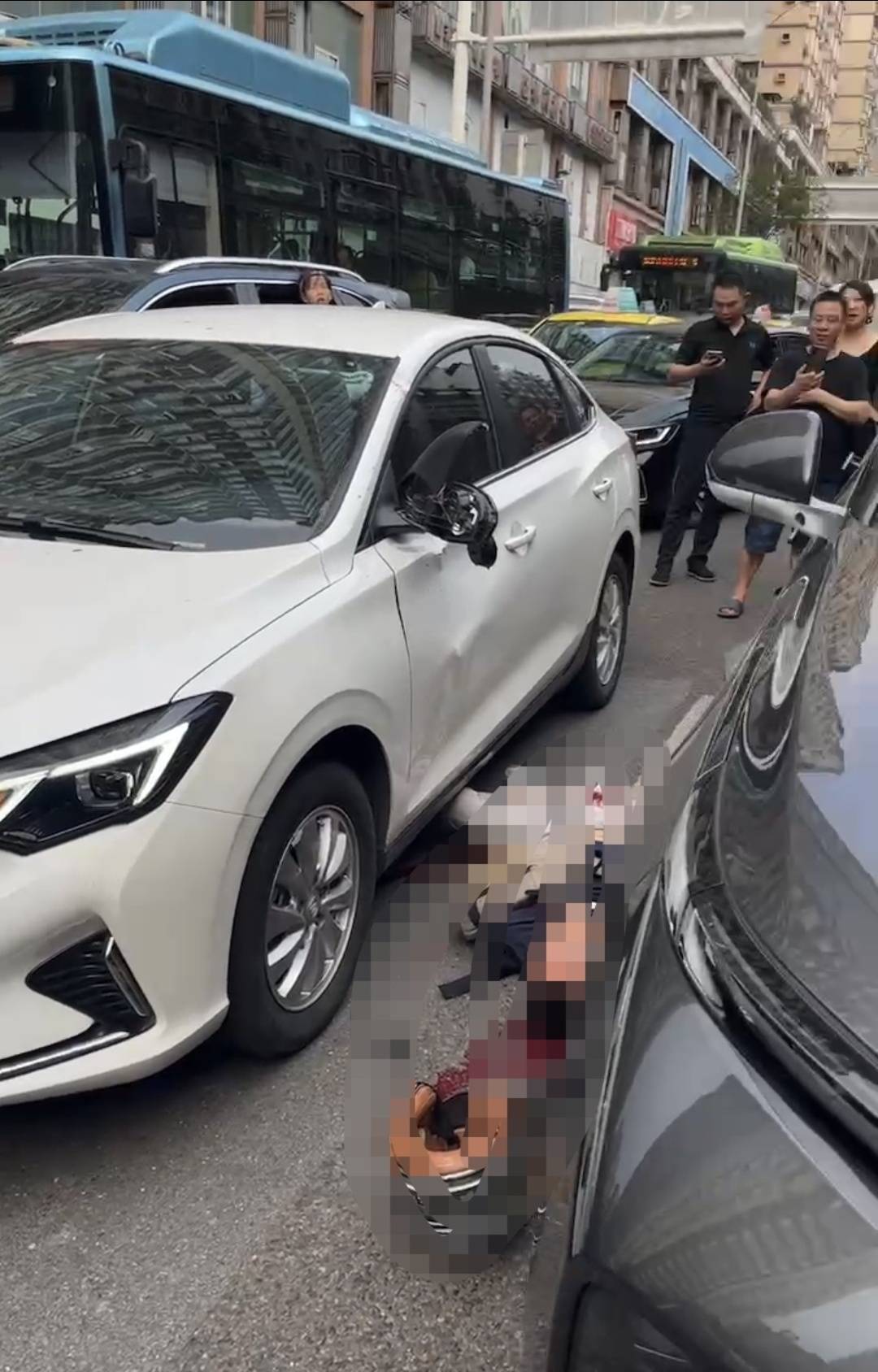 附近商户向记者描述事发后他看到的情景:“当时是三辆车追尾,越野车在中间,后面是一辆电动轿车,前面还有一辆大众轿车。越野车可能一直有些压线,被追尾后方向失控,车一斜冲就把对面来的摩托车骑手给撞下去了。”