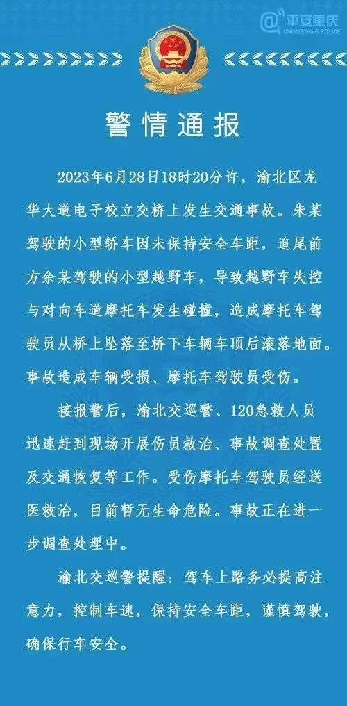 29日中午12点33分,渝北区交巡警通报了28日傍晚发生的这起事故。警情通报称,朱某驾驶的小型轿车因未保持安全车距,追尾前方余某驾驶的小型越野车,导致越野车失控与对向车道摩托车发生碰撞,造成摩托车驾驶员从桥上坠落至桥下车辆车顶后滚落地面。