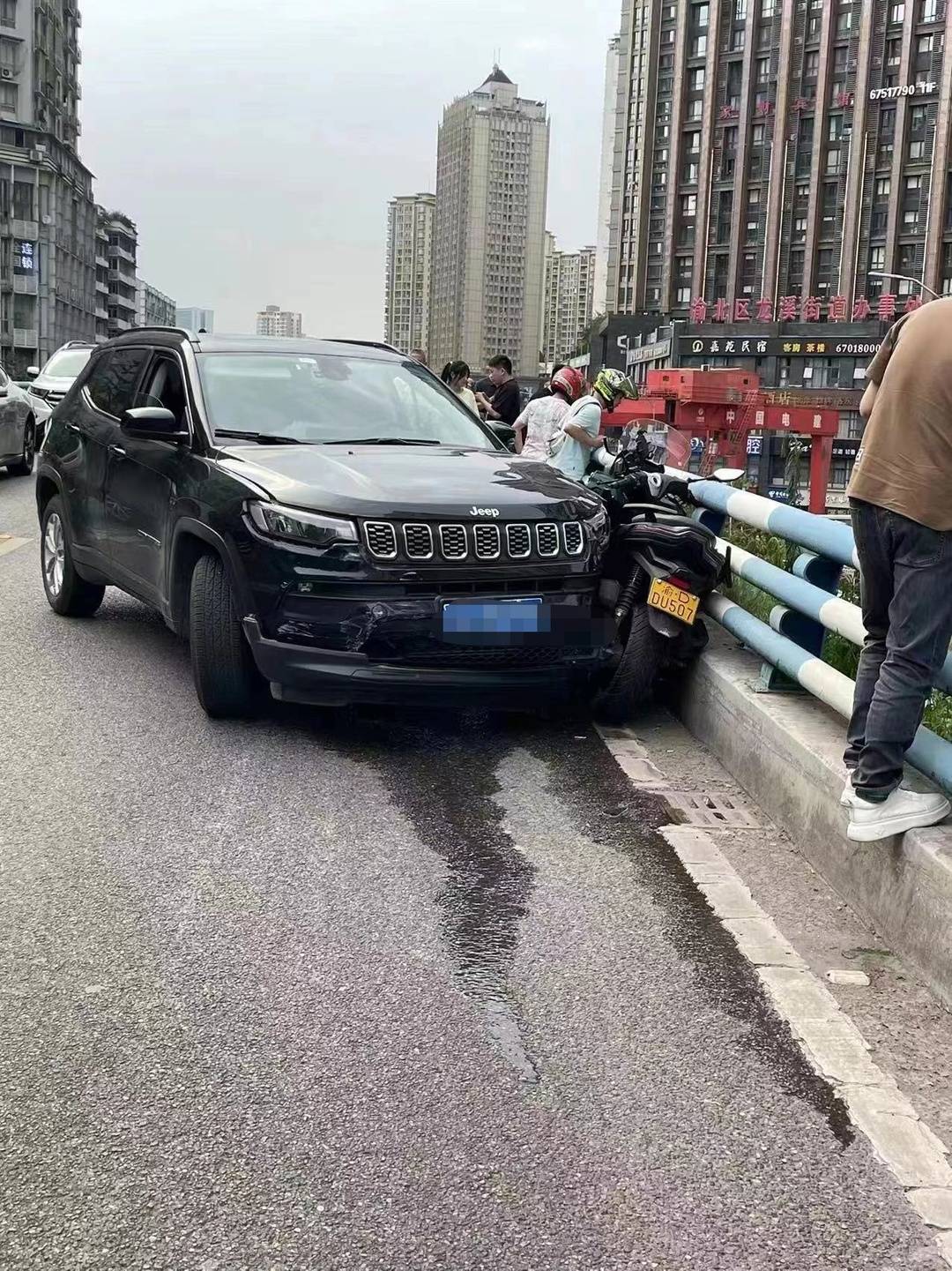 越野车冲到对向车道,把摩托车骑手撞下桥。