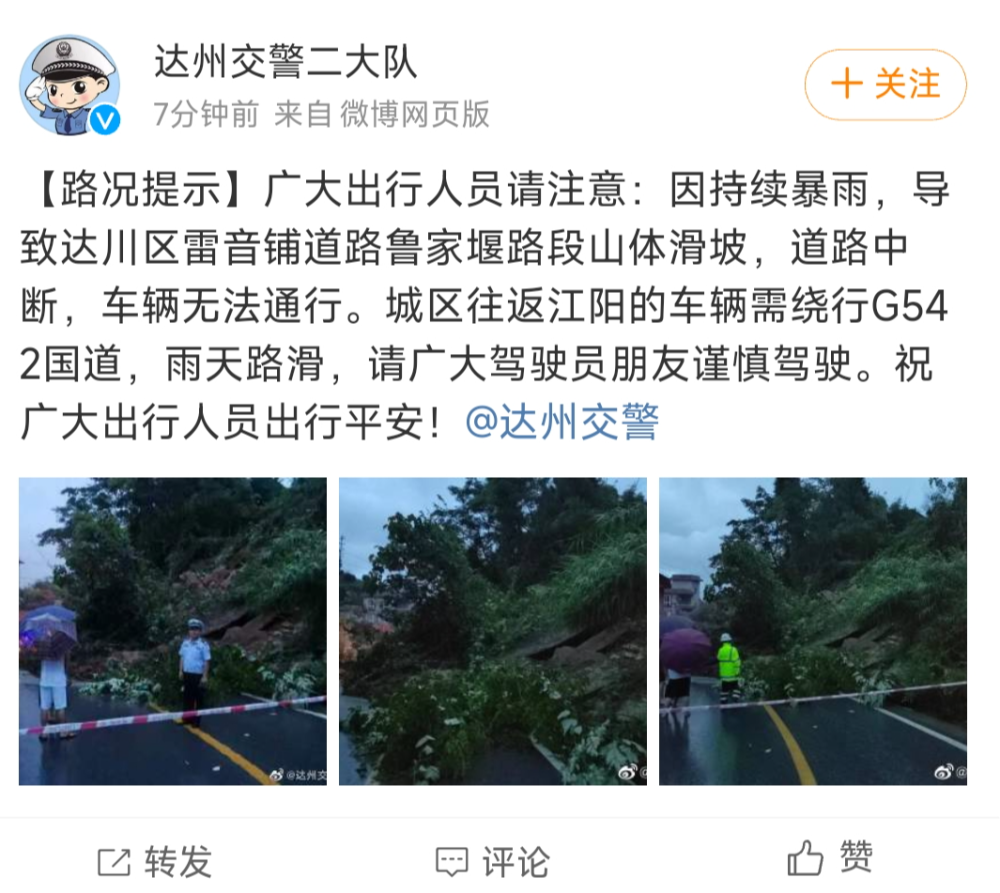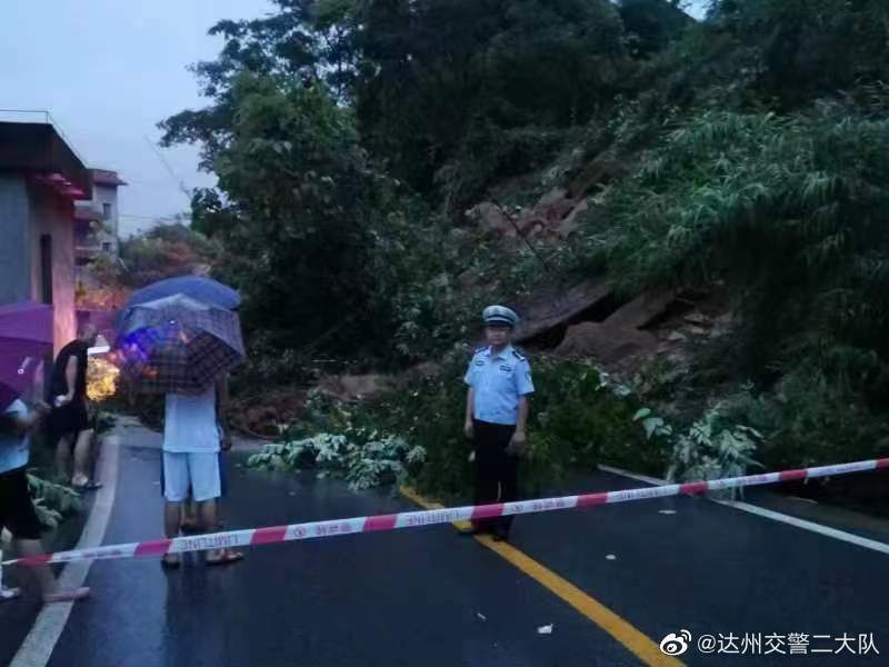 7月2日上午,达州市交警支队二大队发布路况信息,因持续暴雨,导致达川区雷音铺道路鲁家堰路段山体滑坡,道路中断,车辆无法通行。达州交警提示,城区往返江阳的车辆需绕行G542国道,雨天路滑,请广大驾驶员朋友谨慎驾驶。