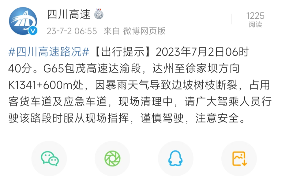 红星新闻记者还了解到,四川高速发布路况信息,2023年7月2日06时40分,G65包茂高速达渝段,达州至徐家坝方向K1341+600m处,因暴雨天气导致边坡树枝断裂,占用客货车道及应急车道,现场清理中,请广大驾乘人员行驶该路段时服从现场指挥,谨慎驾驶,注意安全。
