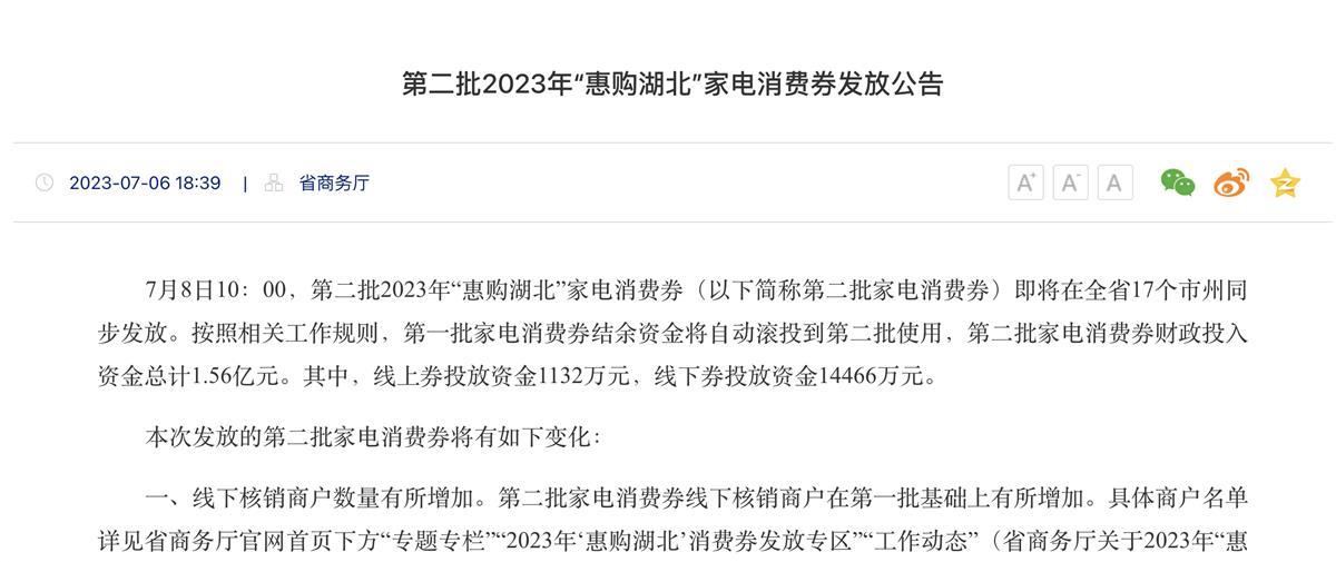 家电消费券发放公告(图源:湖北省商务厅官网)