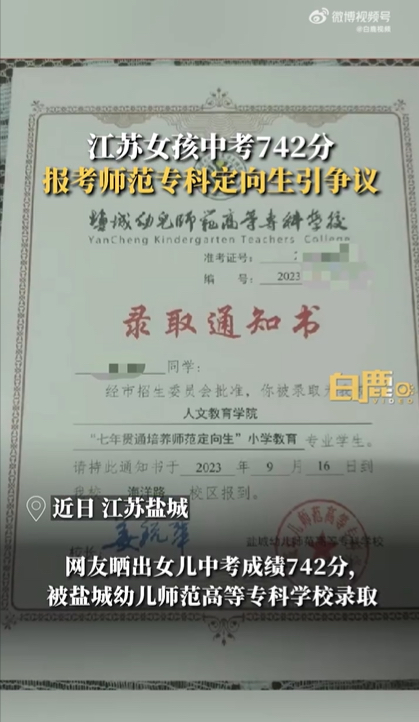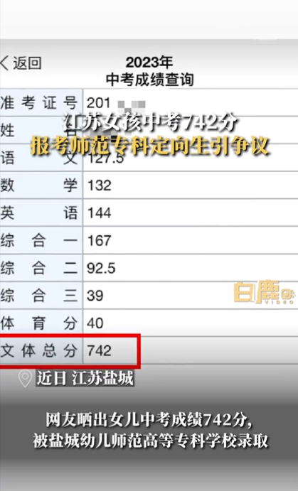 据@白鹿视频报道,近日,江苏盐城,妈妈晒出女儿中考成绩742分,拿到盐城幼儿师范高等专科学校录取通知书,引发网友热议。