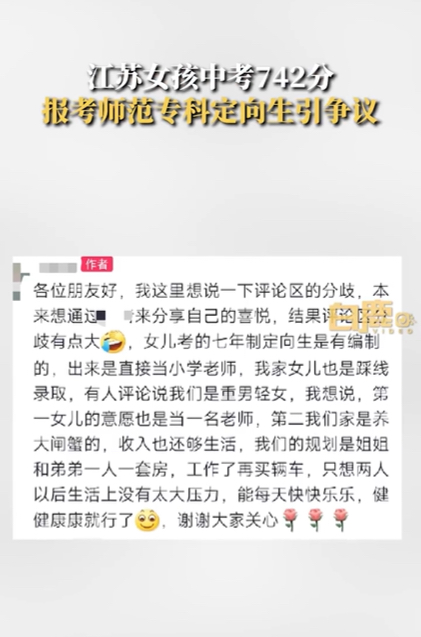 女孩妈妈称,孩子考的七年贯通培养师范定向生是有编制的,出来直接当小学老师。女孩的第一志愿也是当一名老师,家里也不缺钱,只希望姐弟俩以后生活轻松快乐。