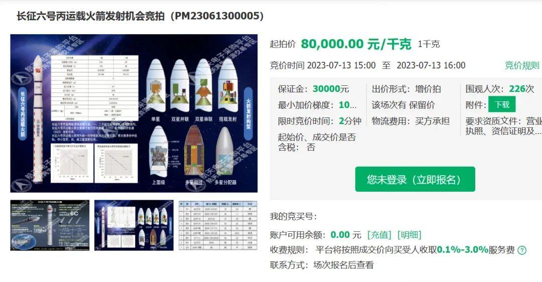 据了解,此次竞拍将在7月13日下午3时开始,参与竞拍的火箭是航天科技集团八院研制的长征六号丙运载火箭,预计今年年底发射。