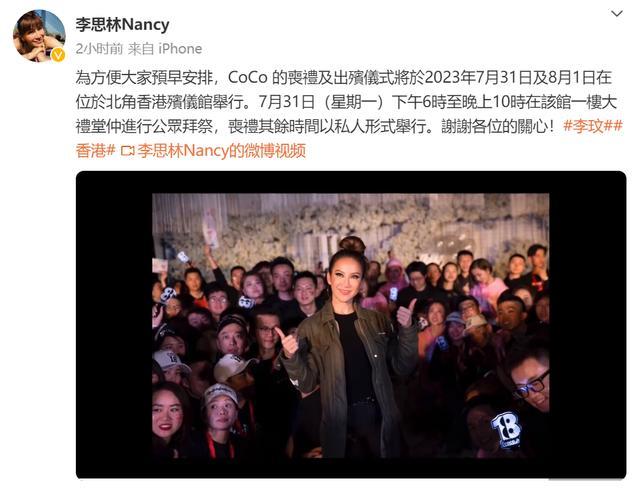 7月14日晚,李玟姐姐李思林在社交媒体发文透露,李玟的丧礼及出殡仪式将于7月31日及8月1日在香港殡仪馆举行。