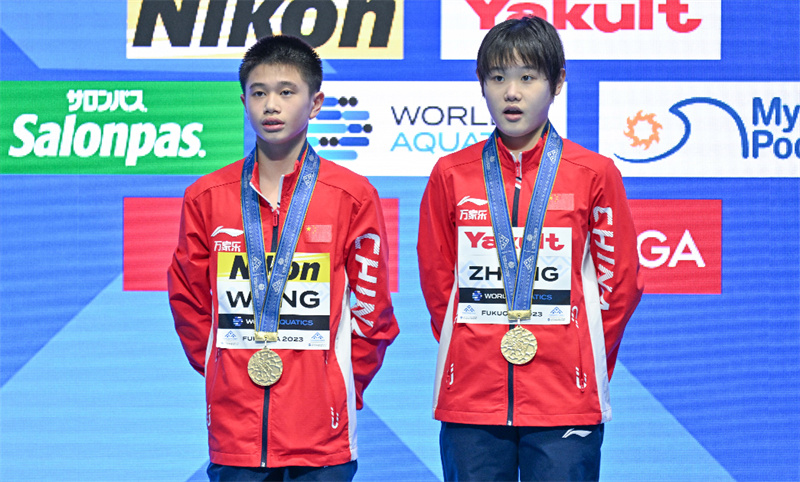 年仅14岁,王飞龙一战成名!北京时间7月15日,在日本福冈举行的第20届世界泳联世界游泳锦标赛中,江苏运动员王飞龙与张家齐搭档,在跳水混双十米台决赛中配合出色,以339.54的高分摘得桂冠,这是中国跳水队在本次世锦赛上摘得的首金。
